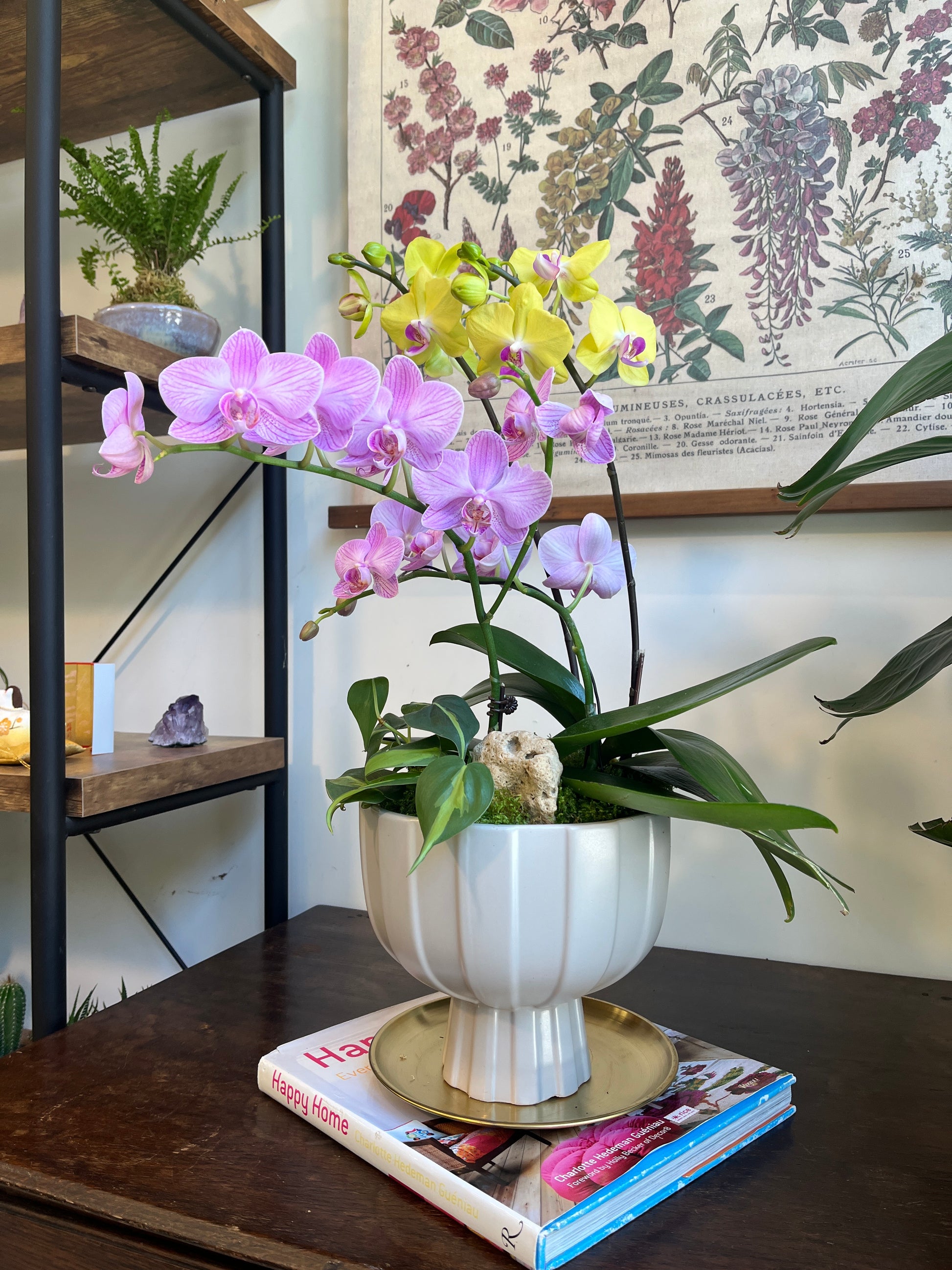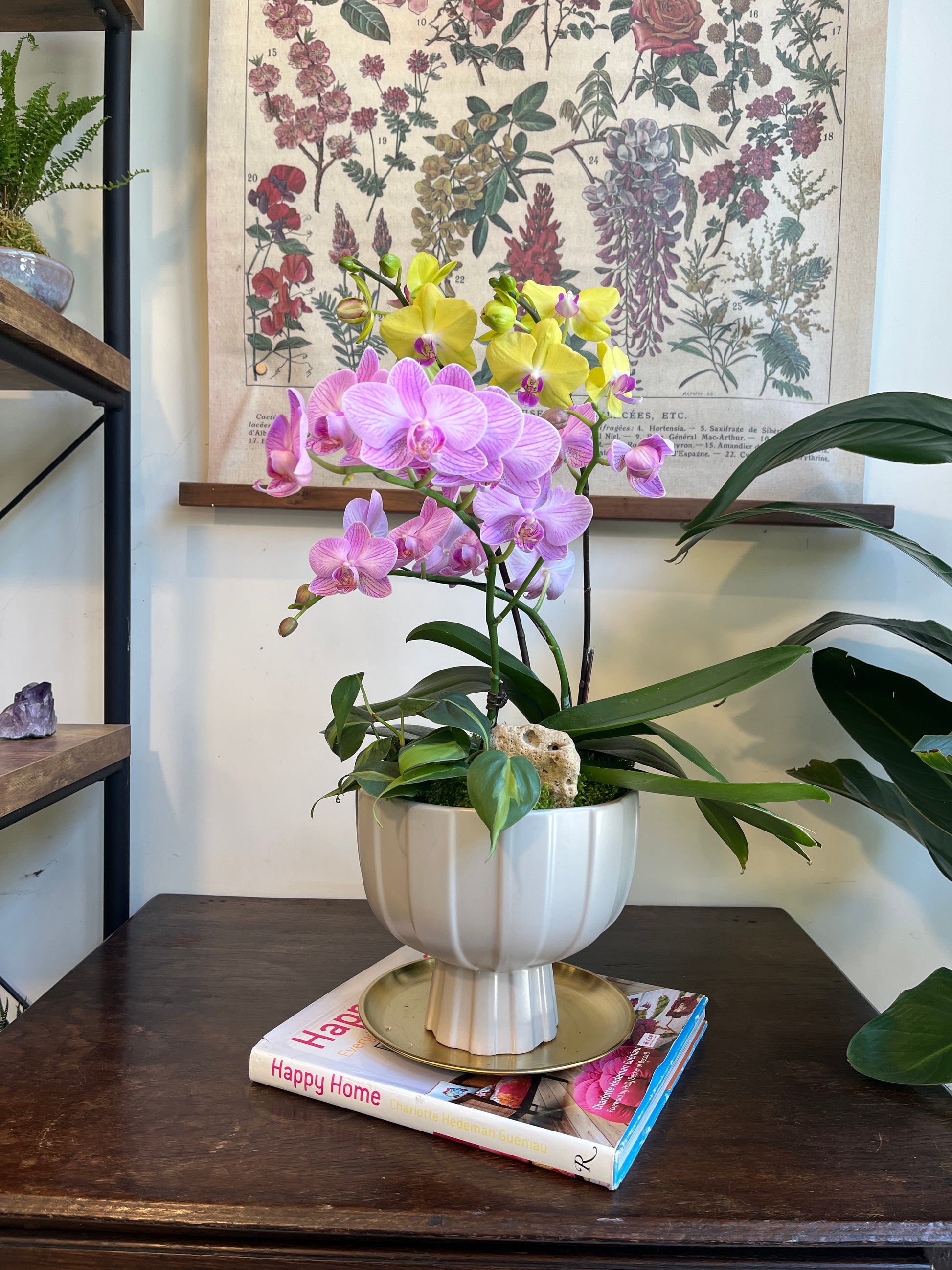 粉色與黃色蝴蝶蘭錯落盛開,